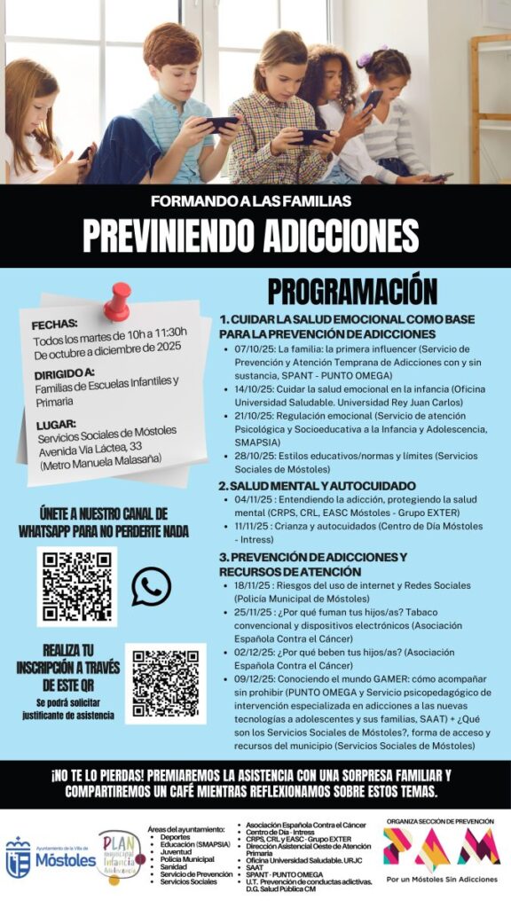 El Plan de Adicciones de Móstoles ofrece diez sesiones gratuitas de prevención de adicciones dirigidas a familias de octubre a diciembre de 2025. El programa «Formando a las familias: previniendo adicciones» se desarrolla los martes de 10:00 a 11:30 horas en el área de Servicios Sociales de Móstoles, ubicada en la Avenida Vía Láctea, 33. La iniciativa, enmarcada en el Plan Local de Infancia y Adolescencia, forma parte de la programación de la Escuela Municipal de Salud 2025-2026 y busca dotar a las familias de recursos para afrontar retos educativos y prevenir conductas adictivas.