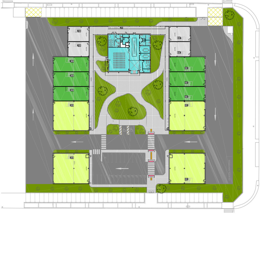 El quinto cuerpo acogerá los servicios centrales, sirviendo de entrada y distribución al resto de instalaciones. Este módulo contará con zonas administrativas, salón de actos, zona de exposiciones, área de coworking y salas de reuniones y laboratorio, entre otras dependencias.