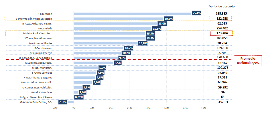 La mayoría de sectores del Régimen General han ganado afiliados tanto en términos mensuales como anuales. En el último año, han destacado especialmente los sectores de Transporte y Almacenamiento (+7,2%), Agricultura, Ganadería, Caza, Silvicultura y Pesca (+4,6%), Actividades Artísticas, Recreativas y de Entretenimiento (+4,5%) y Educación (+4%). Los sectores de alto valor añadido han experimentado un crecimiento destacado desde 2021, con las actividades de Información y Comunicaciones y Científico-Técnicas registrando aumentos superiores al 15%.