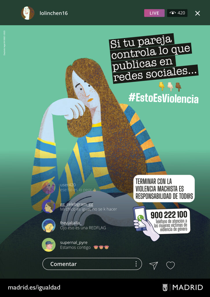 Asimismo, constata que las nuevas tecnologías constituyen un importante foco de exposición a la violencia de género. El 43 % de las jóvenes encuestadas se identifican como víctimas de acoco sexual online y un 15 % admite haber sido controlada a través del móvil. Por ello, la campaña del Ayuntamiento de Madrid presenta una estética similar a la de las redes sociales con mensajes que aluden a situaciones de acoso y control relacionadas con su uso.