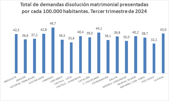 Poniendo en relación las demandas de disolución matrimonial con la población a 1 de enero de 2024, se puede observar cómo la media nacional se situó en 39,6 demandas por cada 100.000 habitantes. Por su parte, la media de la Comunidad de Madrid se situó en 35.