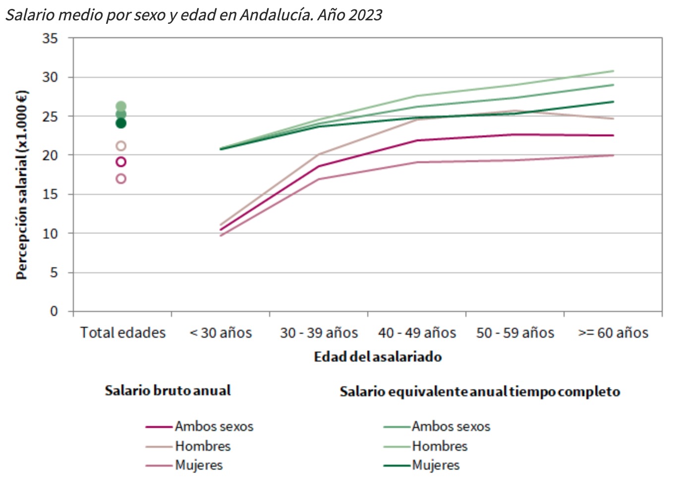 La brecha salarial de género se mantiene significativa: los hombres percibieron 20.192 euros frente a 16.226 de las mujeres, una diferencia del 24,4% que se reduce al 8,8% al considerar el tiempo trabajado. Los mayores de 40 años ingresaron 27.060 euros anuales, mientras los menores recibieron 22.589 euros, aumentando esta diferencia con la edad.