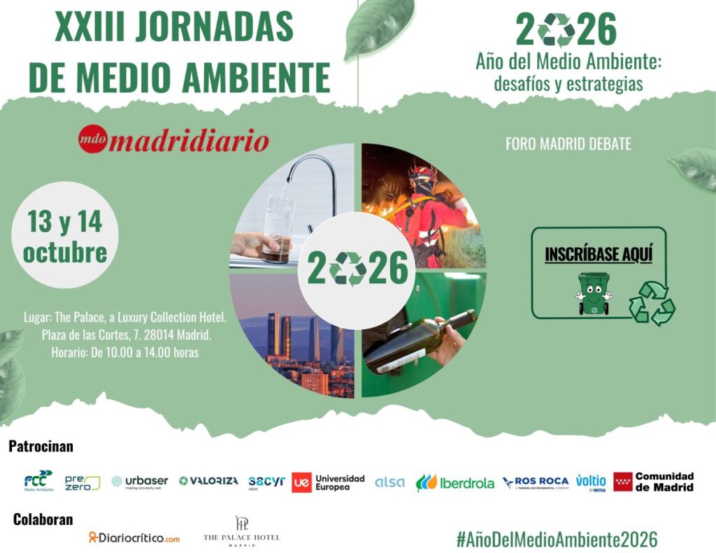 Las XXIII Jornadas de Medio Ambiente, Desarrollo Sostenible y Economía Circular se celebrarán los días 13 y 14 de octubre en el hotel The Palace, a Luxury Collection Hotel de Madrid, bajo el lema ‘2026, Año del Medio Ambiente: desafíos y estrategias’. Madridiario organiza el evento en el marco del Foro Madrid Debate, que reunirá a responsables políticos, empresas y expertos para analizar los retos medioambientales que marcarán el futuro inmediato de la ciudad y de España. Las jornadas se podrán seguir en directo por streaming durante ambos días.
