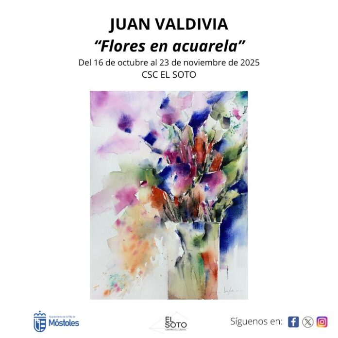 El Centro Sociocultural El Soto de Móstoles acogerá la exposición «Flores en acuarela» del artista Juan Valdivia del 16 de octubre al 23 de noviembre, con 45 obras que exploran la transparencia, la viveza del color y los efectos del agua sobre el papel. La Concejalía de Cultura, Desarrollo y Promoción Turística del Ayuntamiento de Móstoles ha organizado la muestra del acuarelista, que presenta trabajos en distintos tamaños con predominio del formato de 50×70 centímetros. Las flores constituyen uno de los temas más recurrentes en la trayectoria del artista.