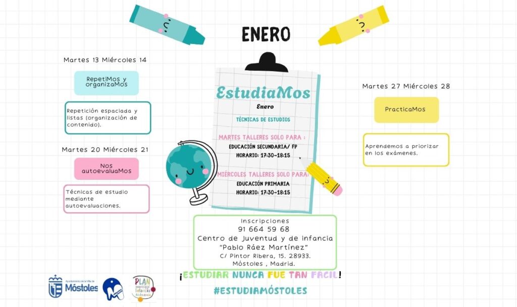 El Ayuntamiento de Móstoles, a través de la Concejalía de Juventud, Familia, Igualdad y Cooperación, impartirá en enero talleres gratuitos de técnicas de estudio dirigidos a estudiantes de Primaria, Secundaria y Formación Profesional. Los cursos se desarrollarán en el Centro de Juventud e Infancia «Pablo Ráez Martínez» y estarán organizados en función de la etapa educativa, con sesiones los martes para alumnos de Secundaria y Formación Profesional, y los miércoles para estudiantes de Primaria.