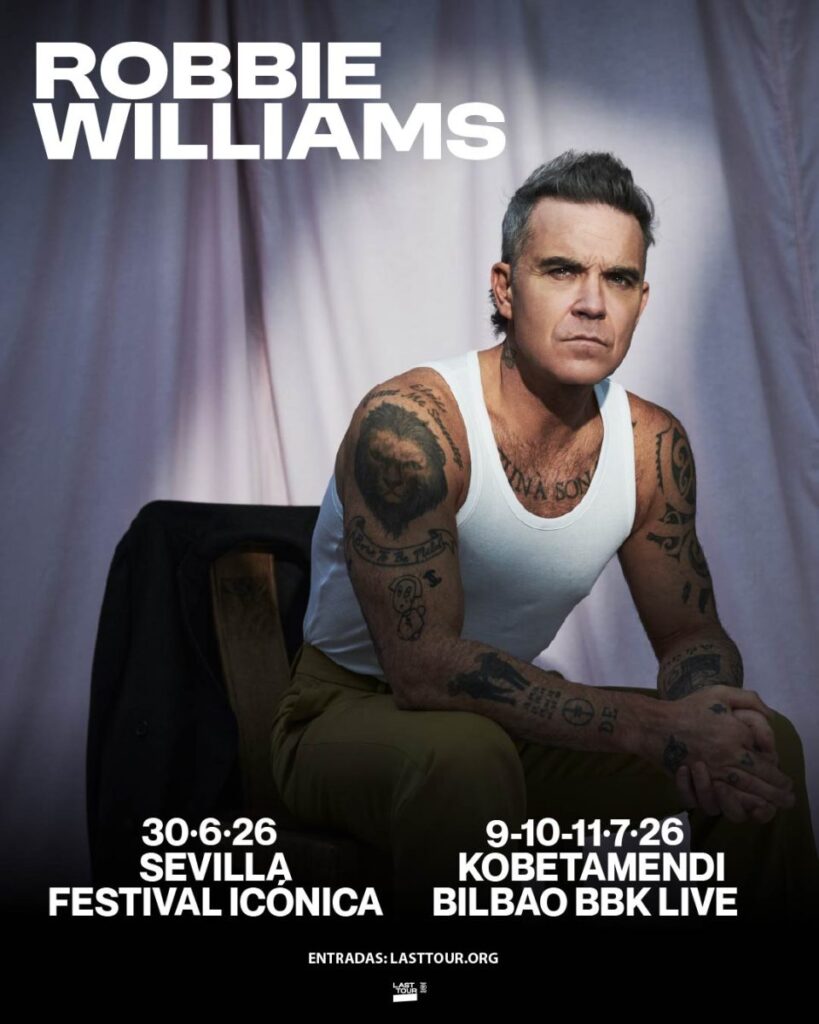 Robbie Williams actuará en Bilbao BBK Live, que se celebrará los días 9, 10 y 11 de julio de 2026, y en Icónica Santalucía Sevilla Fest el 30 de junio dentro de su nueva gira mundial, Long 90’s Tour. El tour celebra el lanzamiento de su nuevo álbum, Britpop, publicado el 16 de enero, con el que consiguió ser el artista con la mayor cantidad de discos número uno en Reino Unido. Las entradas están a la venta en lasttour.org y bilbaobbklive.com.